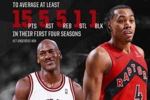 生涯前四季,斯科蒂-巴恩斯场均17.2分7.5篮板5助攻1.2抢断1盖帽;乔丹前四季场均32.7分5.6篮板5.3助攻2.8抢断1.3盖帽。