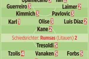 体育资讯10月23日讯 在本轮欧冠,拜仁4-0大胜布鲁日。《图片报》也对拜仁球员本场表现做出评分,具体如下(德媒评分1分最高,5负最低):
